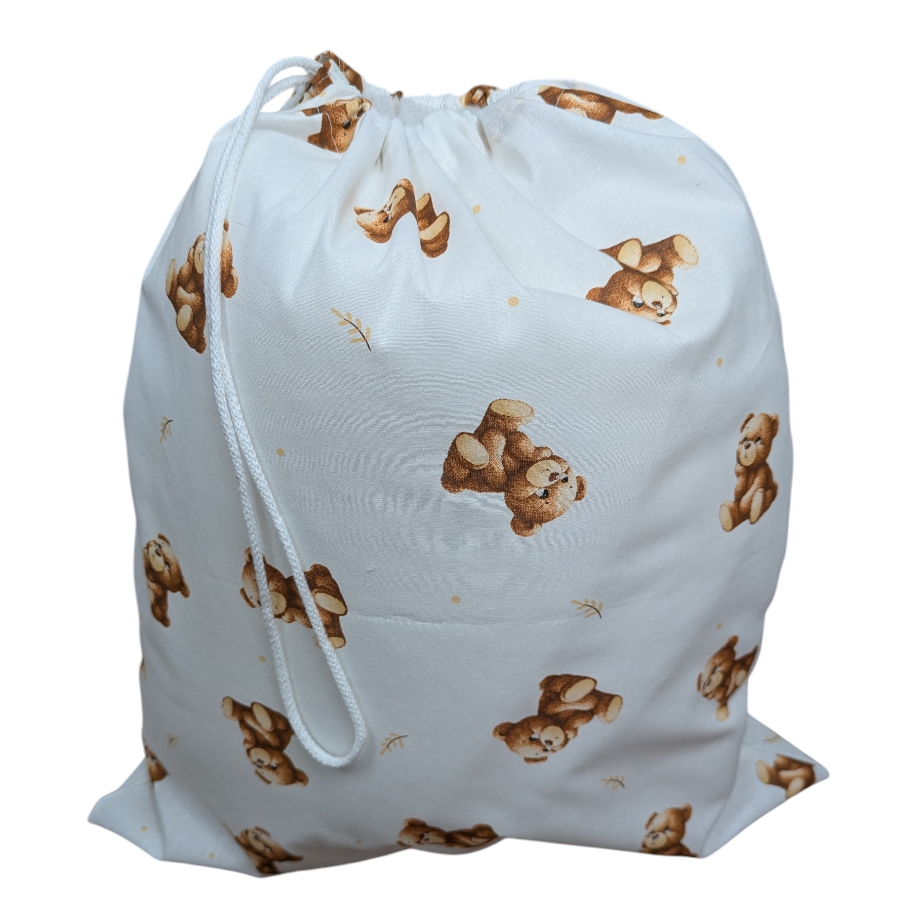- 100% Bawełna: Worek wykonany jest z gęsto tkanej, wytrzymałej bawełny. Jest to materiał naturalny i oddychający, co jest szczególnie ważne, gdy wewnątrz przechowujemy ubranka.