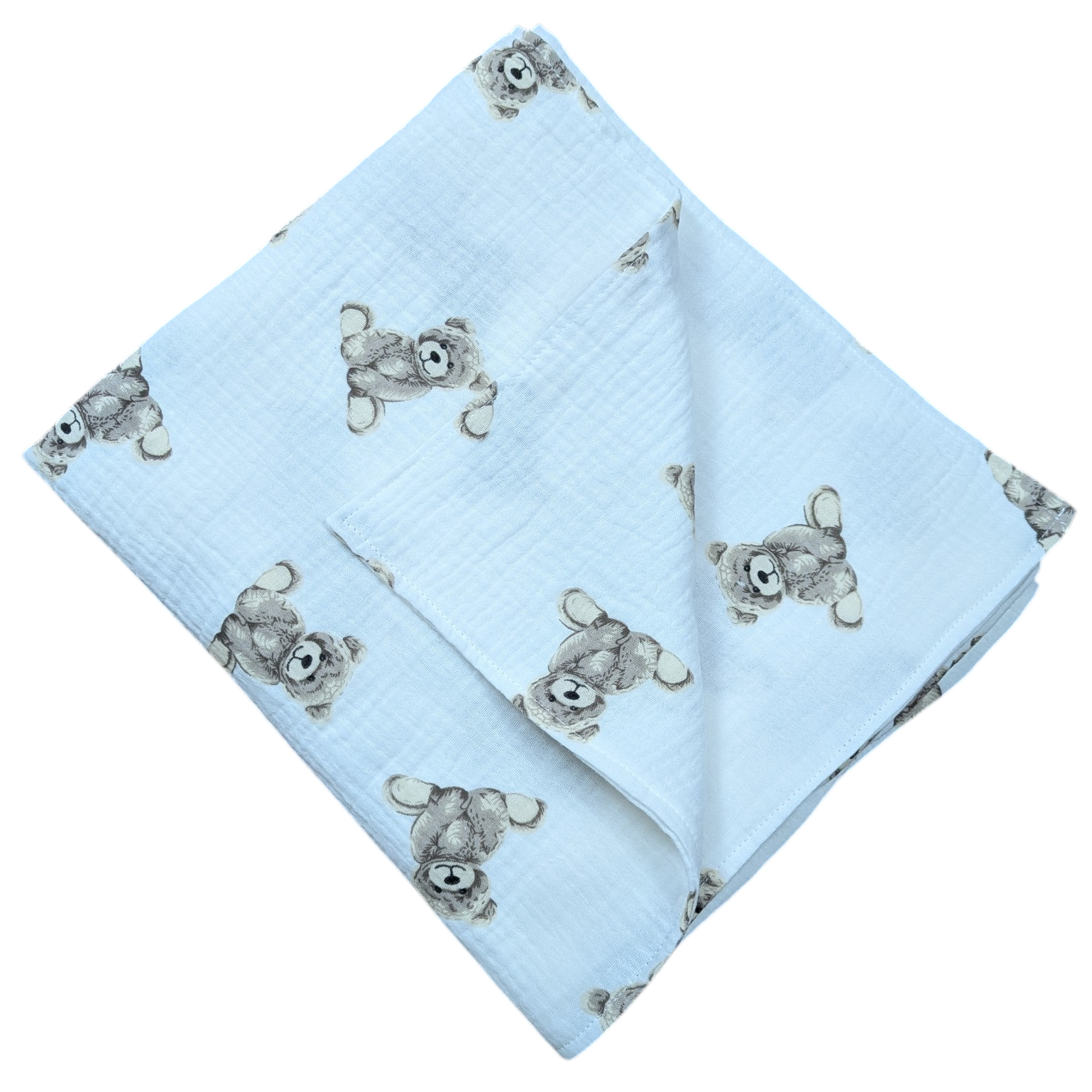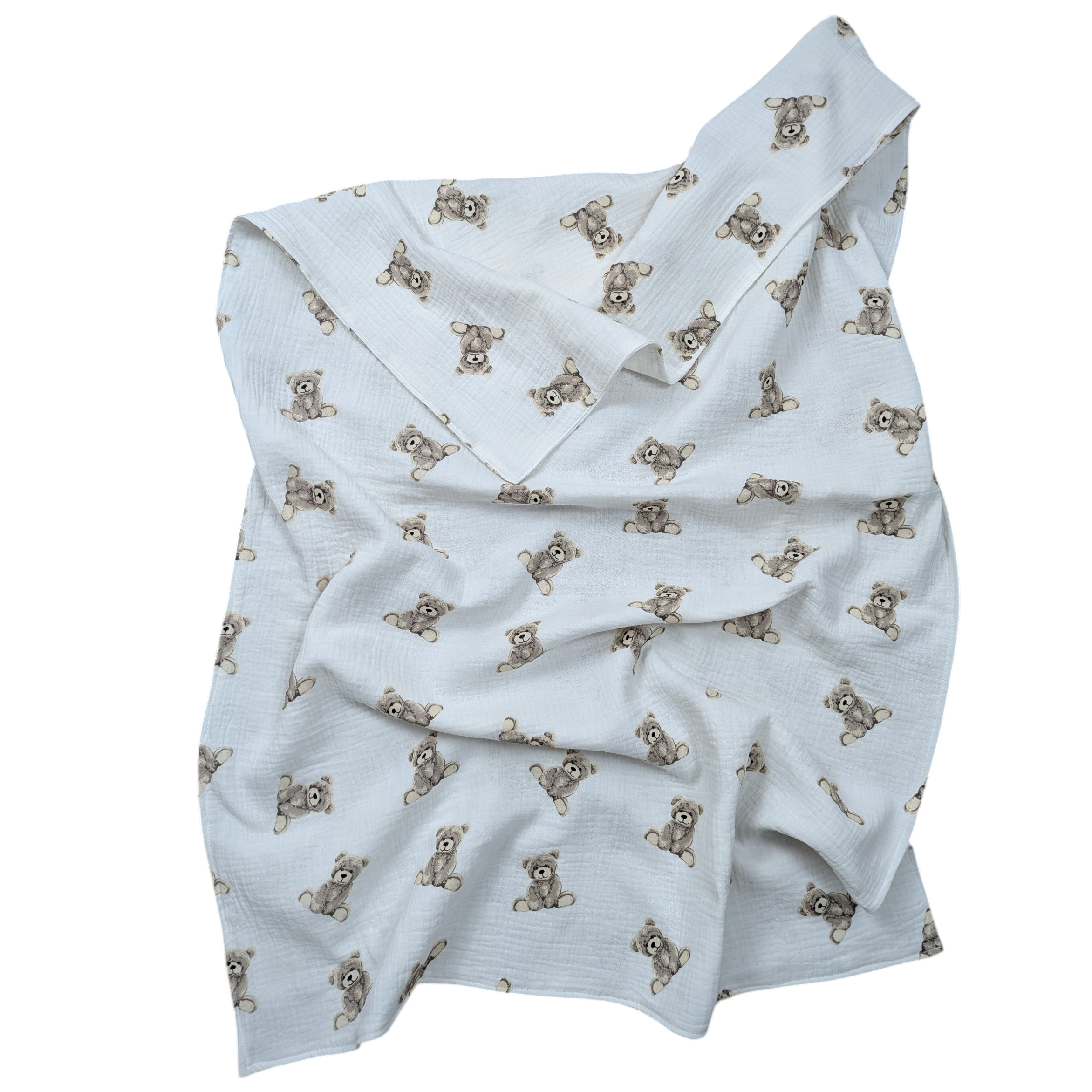 • Podwójna warstwa bawełny (bez wypełnienia): Kocyk składa się z dwóch połączonych warstw muślinu. Taka konstrukcja sprawia, że kocyk jest bardziej „mięsisty” i lepiej otula, zachowując przy tym 100% naturalną oddychalność.